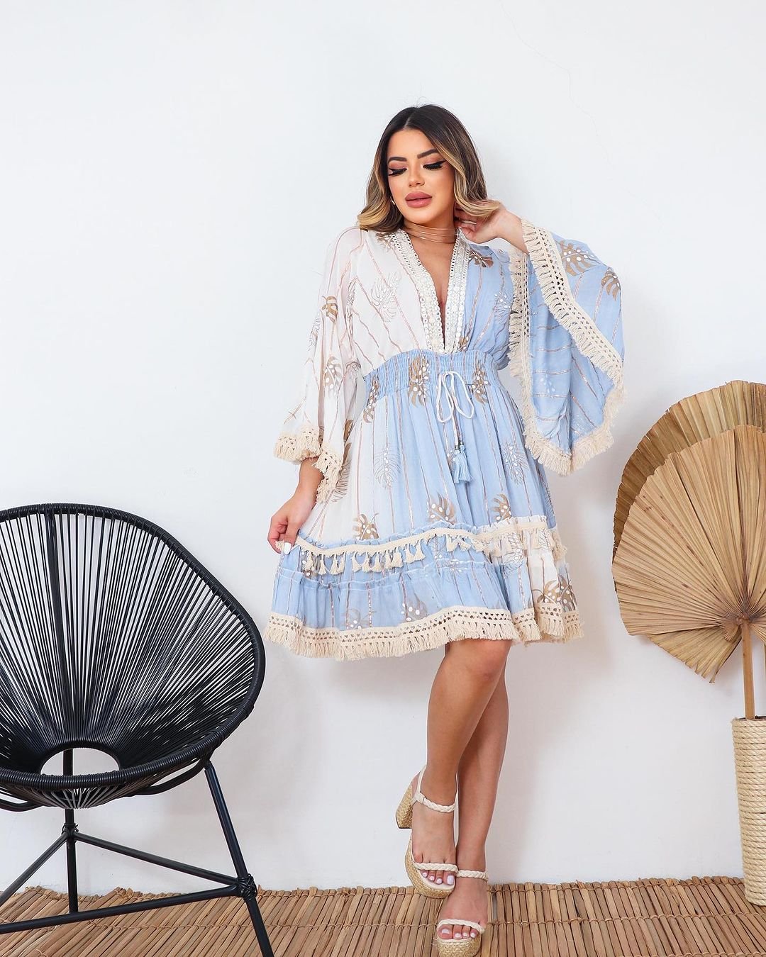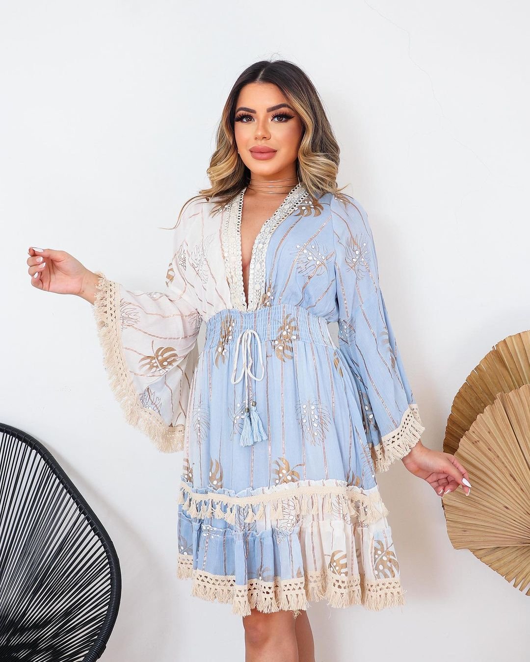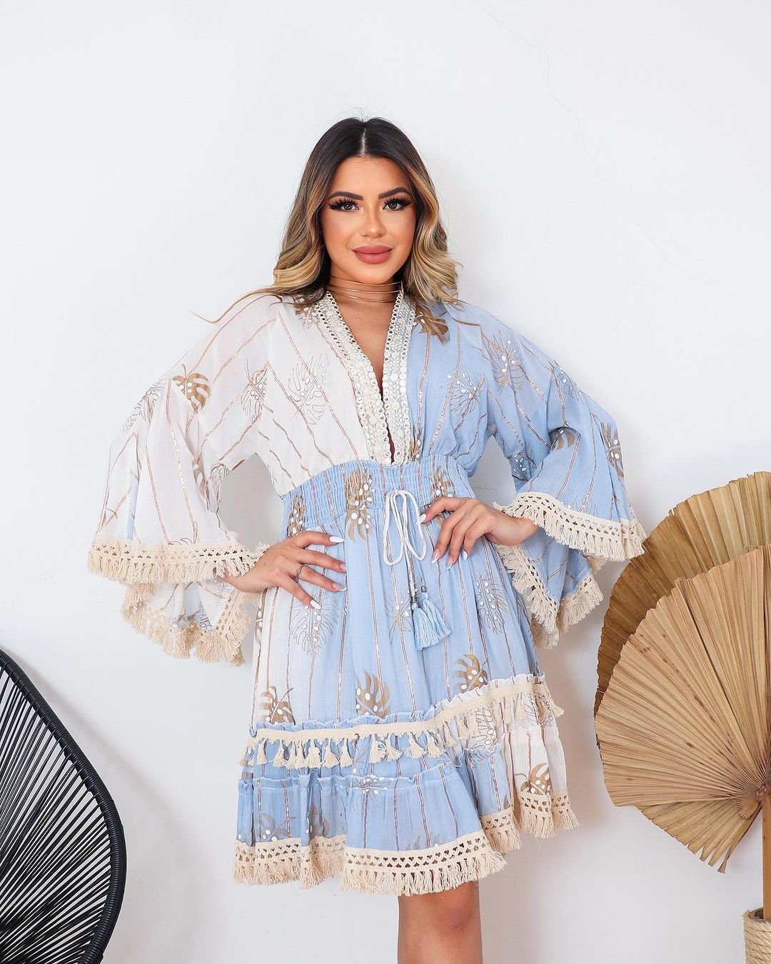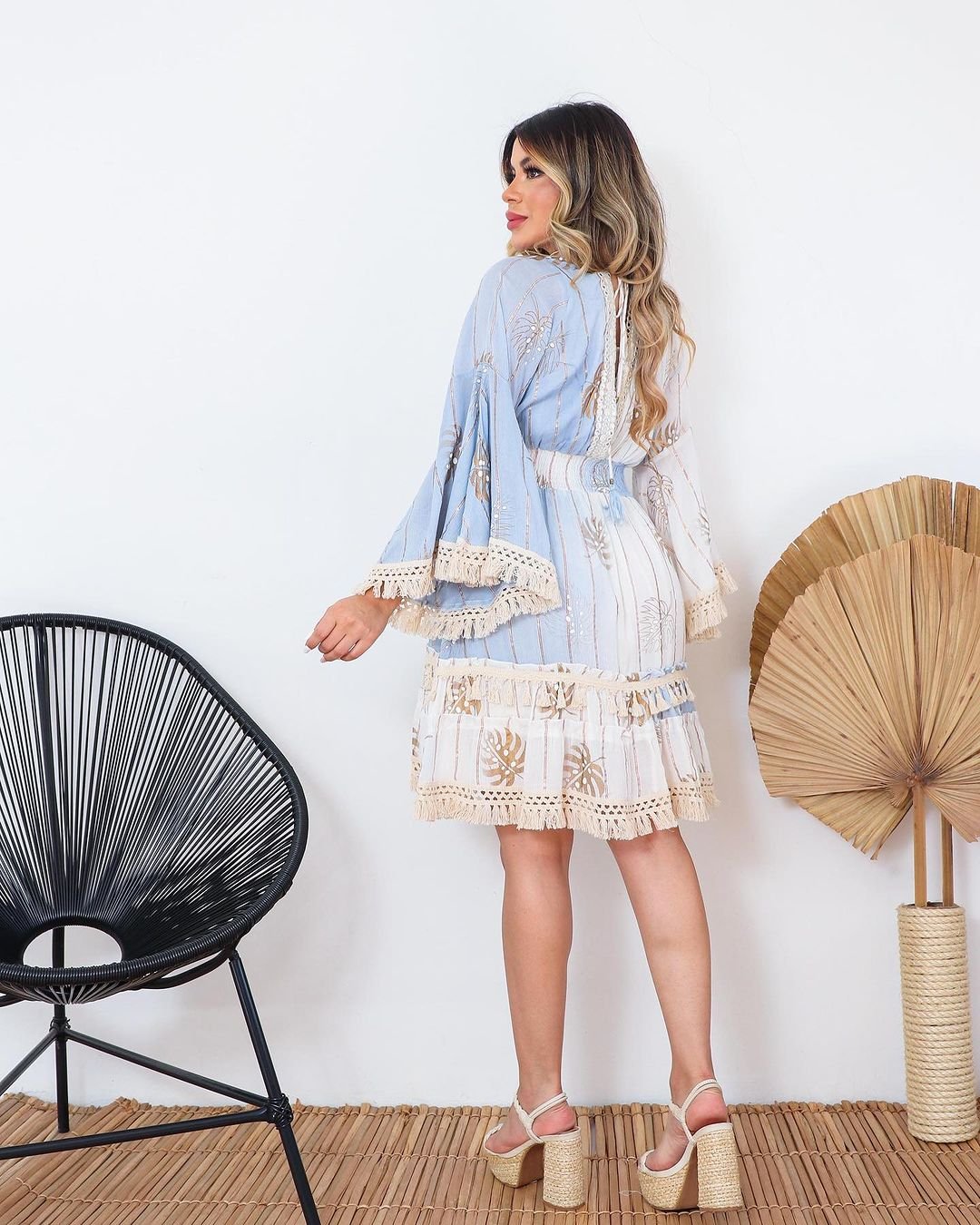 Descubra o charme e a elegância do nosso vestido curto com lastex na cintura, um item essencial para o seu guarda-roupa. Com manga longa e detalhes em franja, este vestido é bordado com fios dourados, trazendo um toque sofisticado e glamoroso para qualquer ocasião.